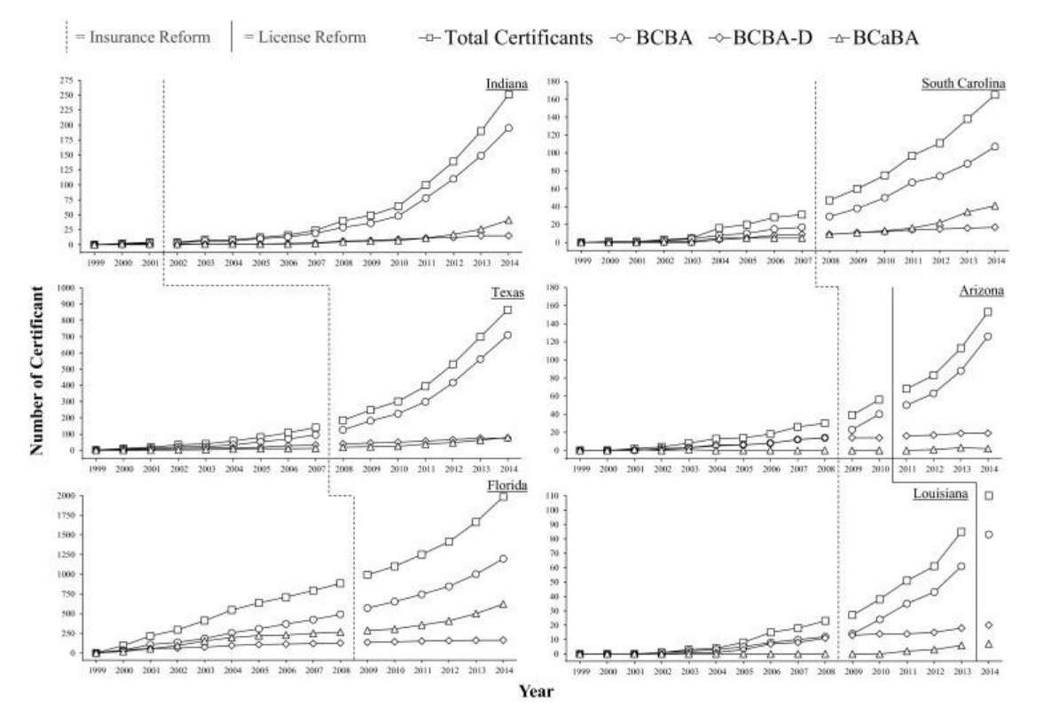 Deochand, N., et al. BACB Certification Trends: State of the States (1999 to 2014). Behav Anal Pract. 2016 Mar 28;9(3):243-52.