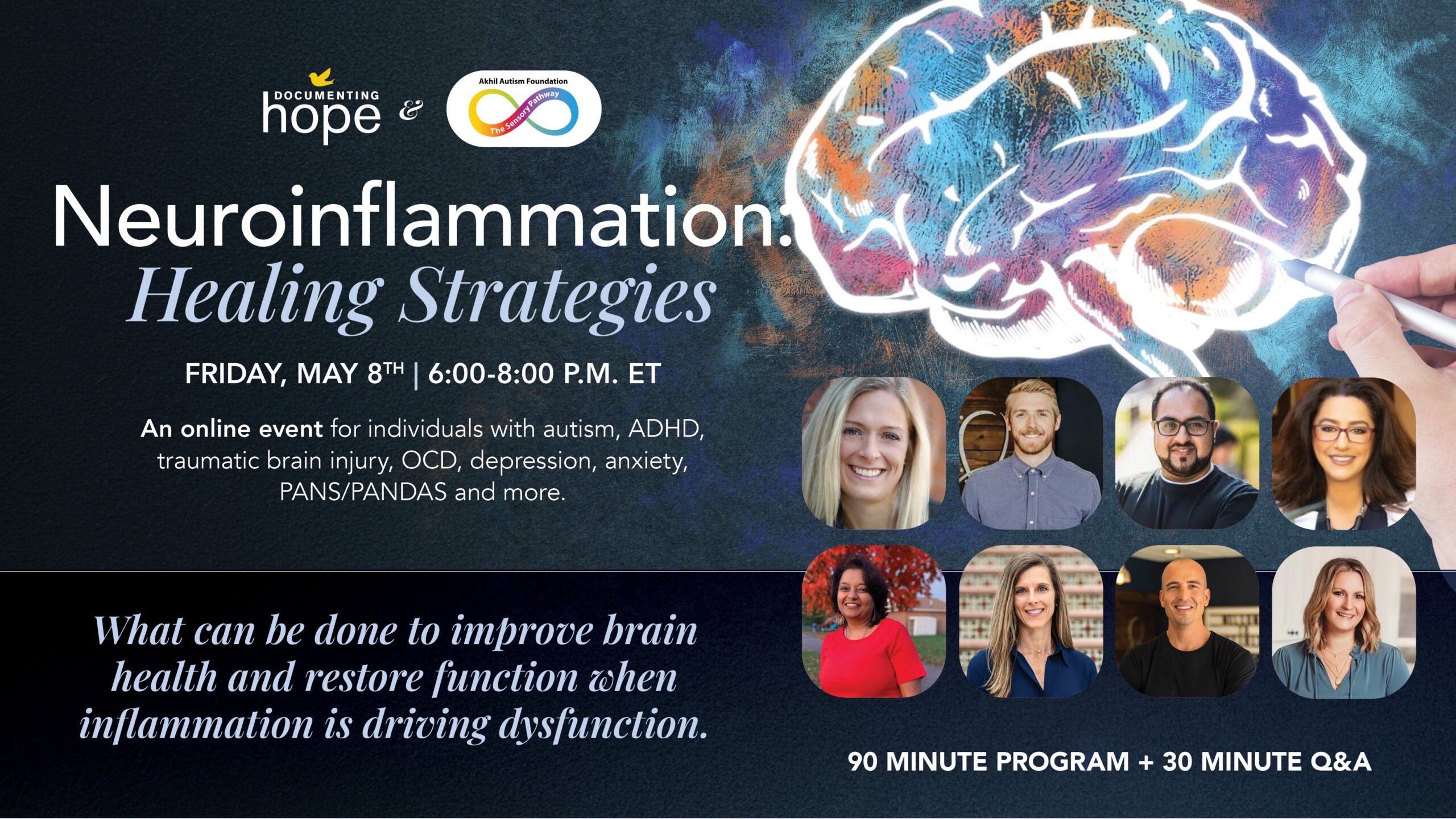 Please join us for the Healing Strategies for Neuroinflammation expert interviews, sponsored by Documenting Hope and Akhil Autism Foundation on Friday, May 8, 2026 from 6:00-8:00pm Eastern. This event is for individuals with autism, ADHD, traumatic brain injury, OCD, PANS/PANDAS, depression, anxiety, and more. Sign up below to join us in this live event! If you can’t make the live event, sign up to get the replay sent to you afterwards.