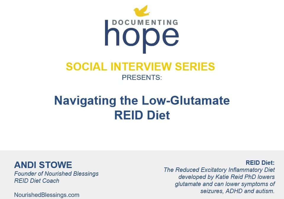 We interviewed Andi Stowe of Nourished Blessings about the low-glutamate REID Diet (Reduced Excitatory Inflammatory Diet) developed by Katie Reid PhD of Unblind My Mind. You can watch the replay below. Please note that you will be asked to provide your email address to continue viewing this video at the 30-minute mark.